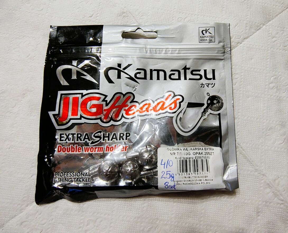 Sprzedam nowe główki jigowe Kamatsu JigHeads Extra Sharp o rozmiarze haka 4/0 i gramaturze 25g. W opakowaniu znajdują się 4 sztuki główek jigowych. Cena za sztukę 2,85 zł.Leszek